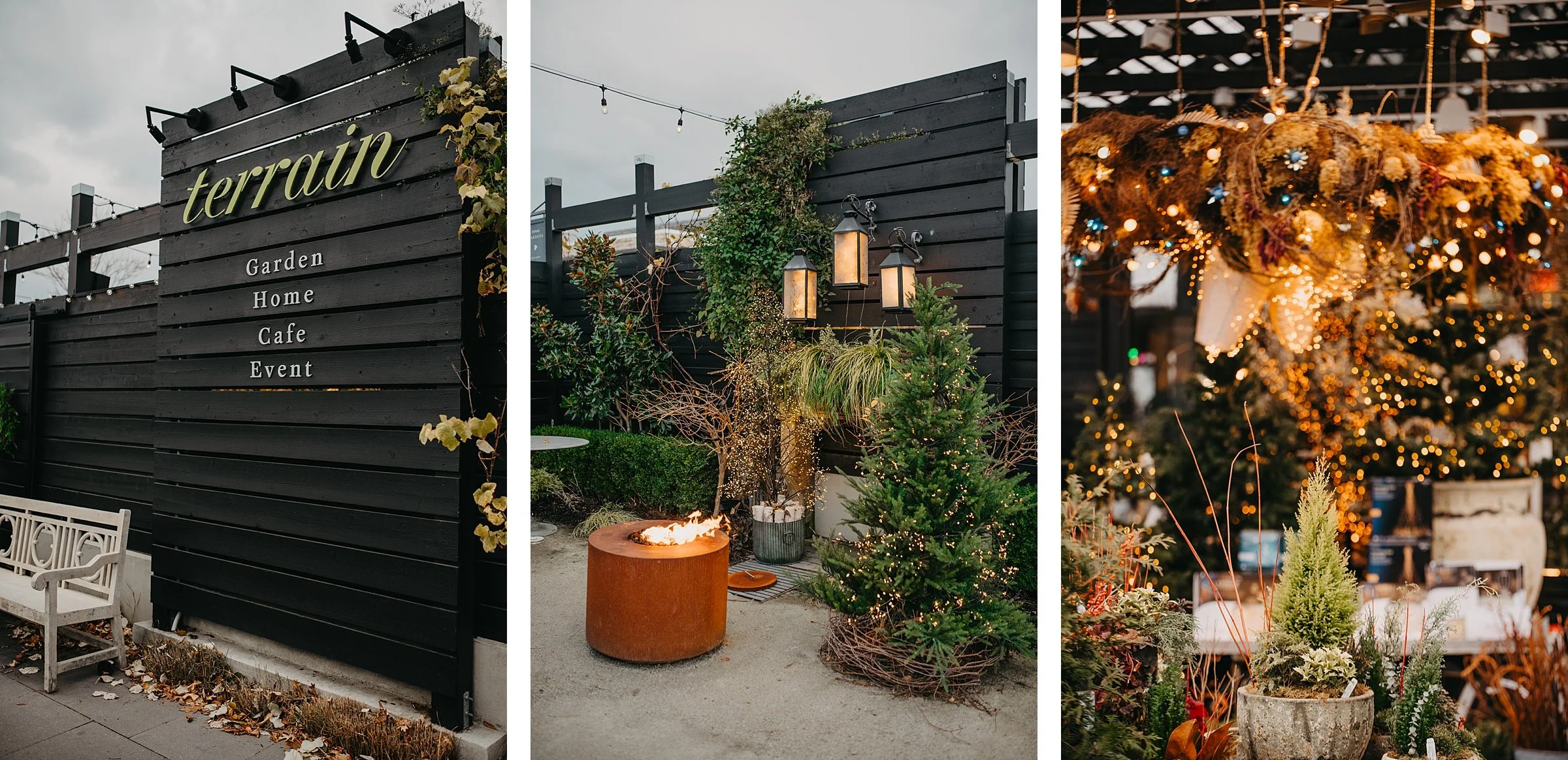 Once the sun sets, Terrain transforms. Candles flicker, bistro lights glow, and the reception becomes warm and intimate rather than loud and formal.